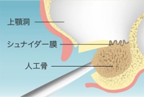 上顎の骨は薄く、その上には上顎洞(副鼻腔のはひとつ。蓄膿症で膿が溜まる場所)という空洞があります。もしインプラントが顎骨を突き抜けて上顎洞まで貫通してしまうと、感染が起き上顎洞炎を発症するリスクがあります。そのため骨の厚みが不足している場合は「上顎洞底挙上術」という骨造成(移植)処置を行う必要があります。この骨造成は高度な技術を要するので、経験と知識に裏付けされたインプラント執刀医が行うことが推奨されます。
